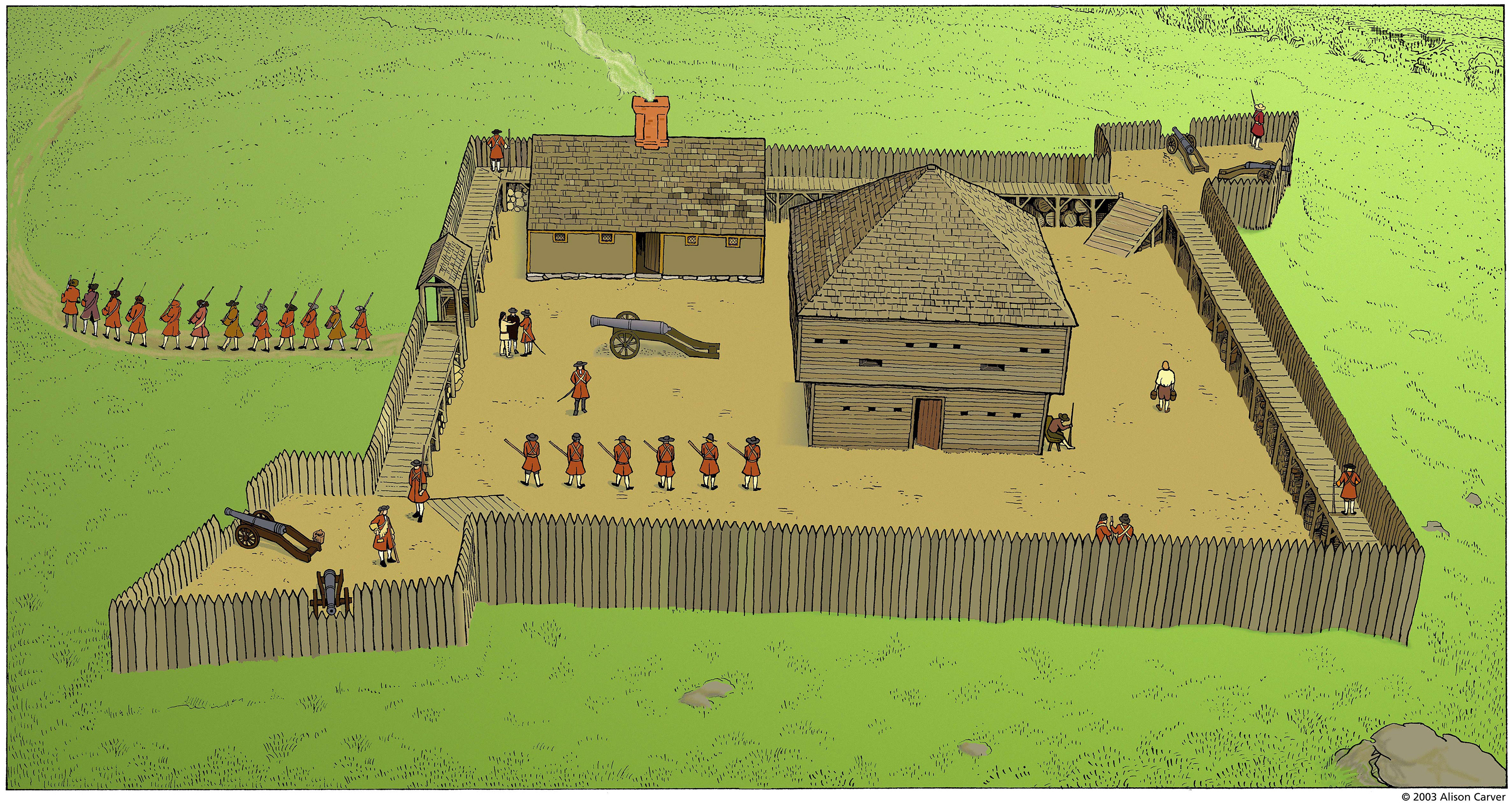 17th-century characters and scenes from Pemaquid's early forts and settlements, as well as interpretations of a fort's possible structure based on the historical record.